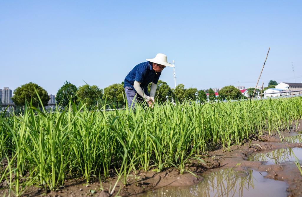 记者循着周雷同事手指的方向看过去,一个头戴草帽、脚穿胶鞋、皮肤黝黑的“庄稼汉”正弓着腰在稻田里忙碌,他身上的衣服早已被汗水浸透。