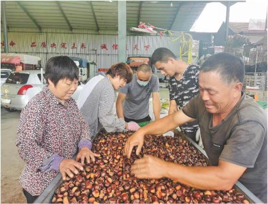 蒙阴县野店镇继余果品农民专业合作社冷库前,村民们正将运来的板栗检查、包装、入库。(□记者于新悦报道)