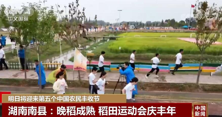 在湖南益阳南县,近年来这里主要发展稻虾种养产业,面积达到了60多万亩。眼下,大片晚稻成熟,在金黄的稻田里,当地群众举行稻田趣味运动会、美丽乡村健康跑等丰富多彩的活动,分享丰收喜悦。