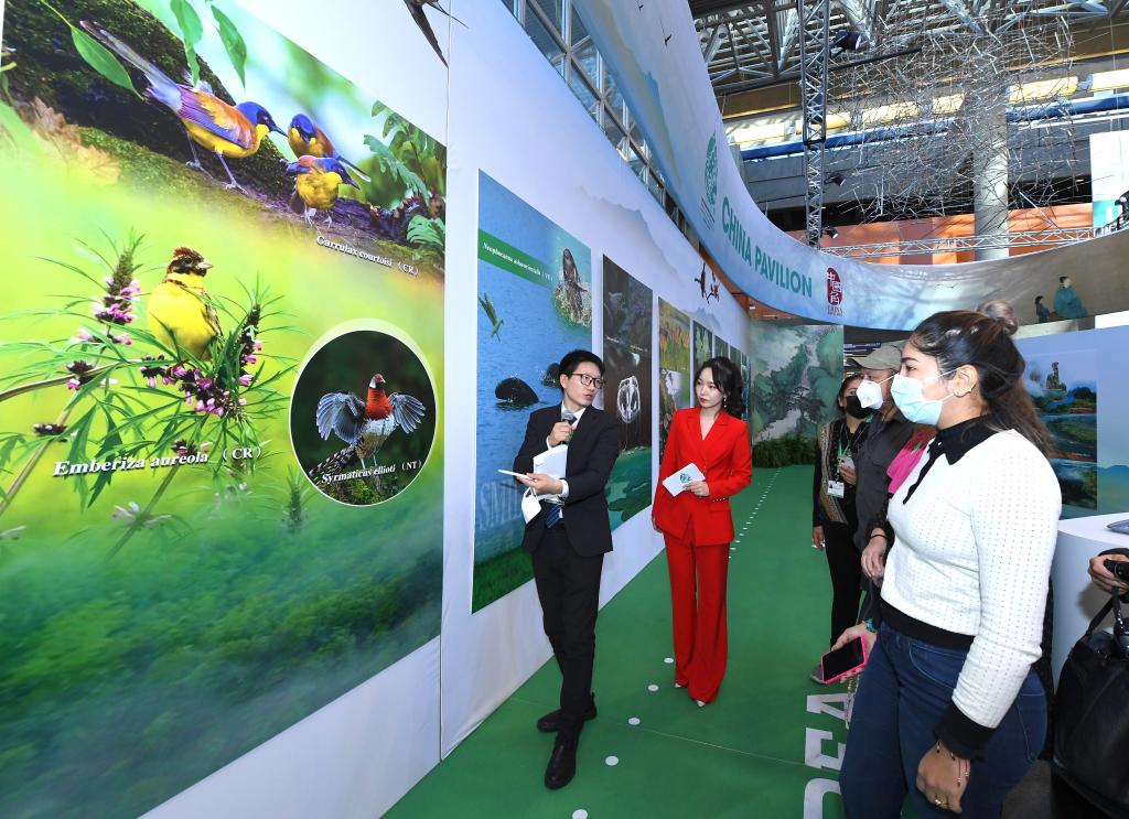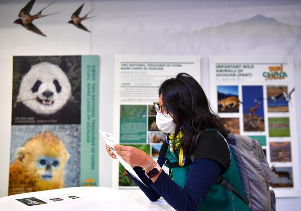 2022年12月11日,与会者在加拿大蒙特利尔《生物多样性公约》第十五次缔约方大会(COP15)第二阶段会议的中国角四川日活动上了解生物多样性保护成果。(新华社记者连漪摄)