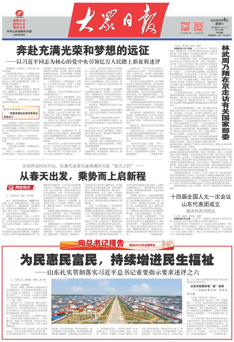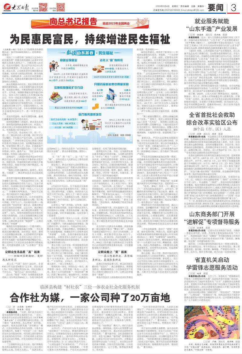 大众日报2月27日起推出“向总书记报告”大型全媒体主题报道,聚焦山东深入贯彻落实习近平总书记重要指示要求、扎实做好各项工作的生动实践,为深入贯彻落实党的二十大精神、奋力谱写中国式现代化山东篇章,凝聚磅礴奋进力量。今天刊发第六组报道《为民惠民富民,持续增进民生福祉》,请看全文——