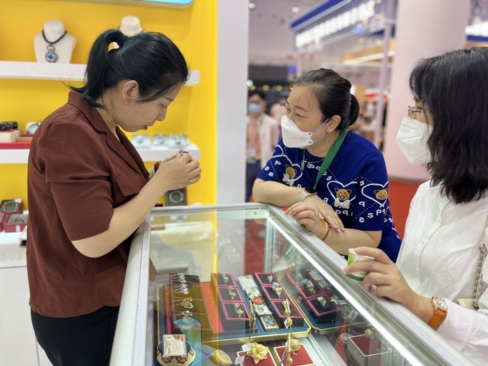 福人楼珠宝带来的福文化纯手工传承技艺产品和国潮元素产品也广受好评。深谙创新之道的福人楼此次参展消博会做了充分准备。“我们为消博会专门打造了‘圆满’系列的国潮元素产品,纯手工花丝镶嵌融入鹤、鱼等国潮风元素,每一款都是手工打造、单款单件。”福人楼珠宝发展事业部经理张静表示,“从这几天的销售看,鲜明的中国风和单款单件的特点很能打动外商,他们买了作为伴手礼带回去。”