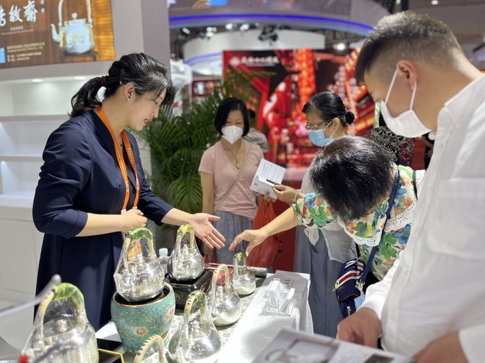 铜金蟾文化创意有限公司目前正在“跨界”拓展茶馆业态,首店即将在济南开业,并有发展连锁的长期计划。在此次展会上,铜金蟾在作为参展商同时俨然成为“买山东”的采购商:将采购吉纹斋的银壶,并定制淄博大染坊的高端真丝织锦画。“目前我们谈的是千里江山图、富春山居图,后续我们公司会根据他们的具体需求,融入他们的图案,在数量和工艺方面进行更加精细化、个性化的定制。”淄博大染坊艺术品有限公司负责人李丽告诉新黄河记者。