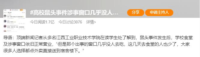 近日,在江西一高校官微6月3日通报“食堂吃出老鼠头”事件后,由于官方和网友的反应不一,今日,“涉事窗口几乎没人去吃饭”话题又登上热搜。