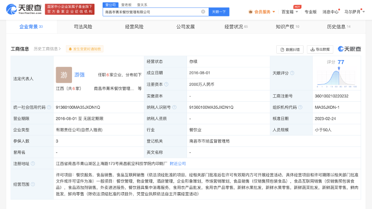 据天眼查App显示,涉事食堂运营方南昌市菁禾餐饮管理有限公司成立于2016年8月,注册资本2000万人民币,经营范围包括餐饮服务、食品销售等。年报信息显示,该公司2016年至2020年参保人数为均0,2021年参保人数为3人。