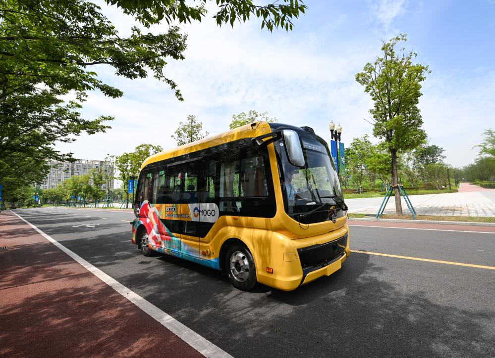 7月15日,一辆自动驾驶巴士行驶在大运村的路上。新华社记者 王曦 摄
