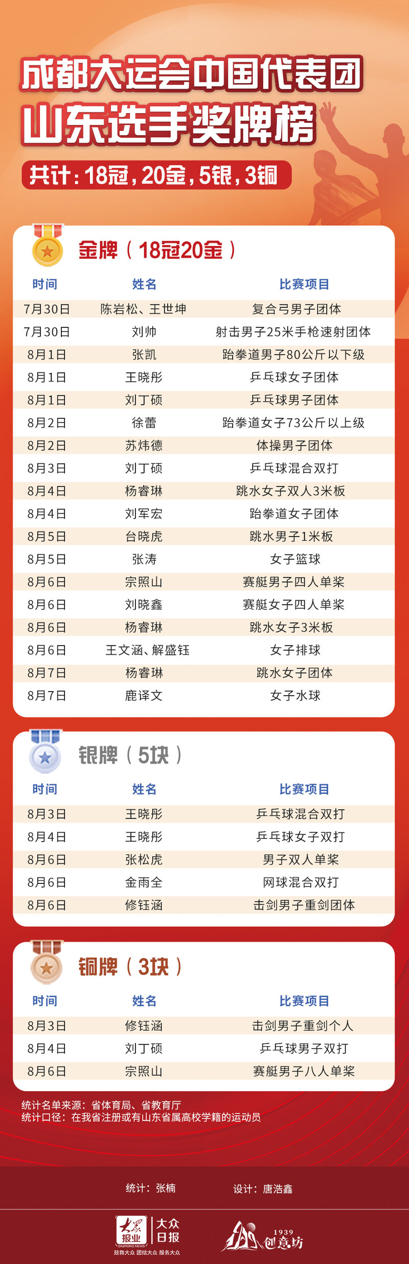 18冠20金!来看成都大运会中国代表团山东选手奖牌榜
