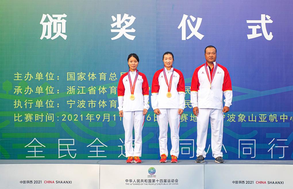 图为第十四届全运会女子470级场地赛颁奖仪式上,获得第一名的魏梦喜(左)、高海燕(中)与教练员合影。新华社记者 江汉 摄