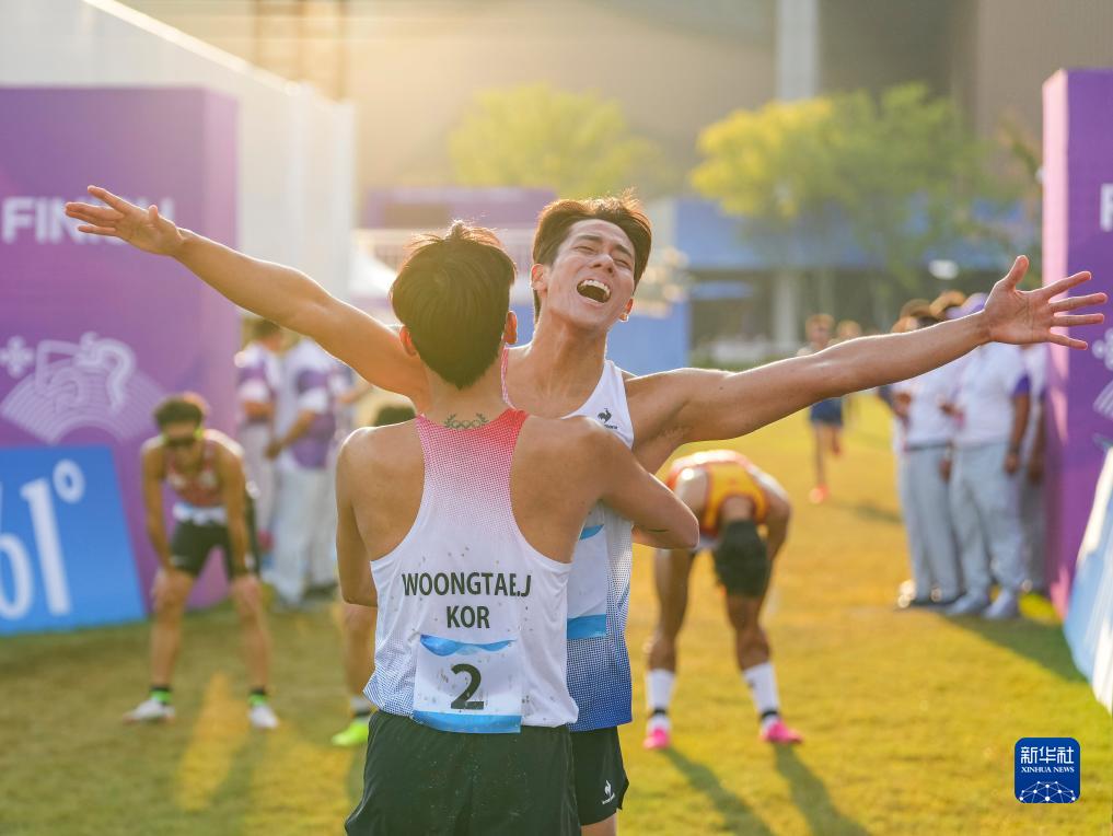 9月24日,韩国队选手全雄泰(前)和鄭振和在男子个人激光跑比赛后庆祝。