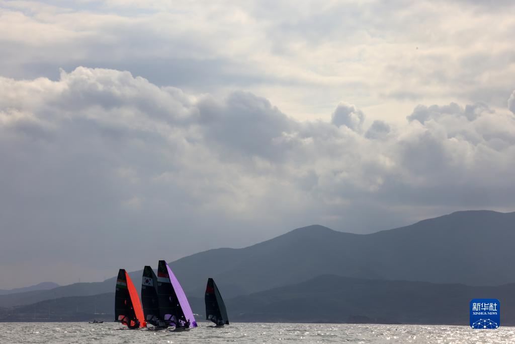 当日,杭州亚运会帆船项目男子快速艇-49人级比赛在浙江省宁波市象山亚帆中心继续进行。