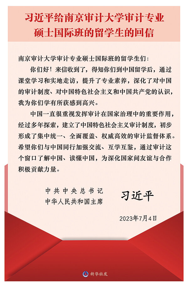 2023年7月4日,习近平总书记给南京审计大学审计专业硕士国际班的留学生的回信。 新华社发