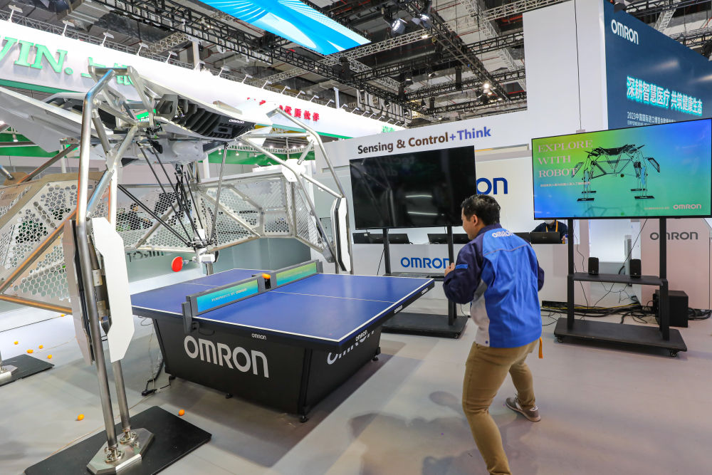 ↑11月2日,工作人员在欧姆龙展位测试乒乓球教练机器人。新华社记者辛梦晨摄