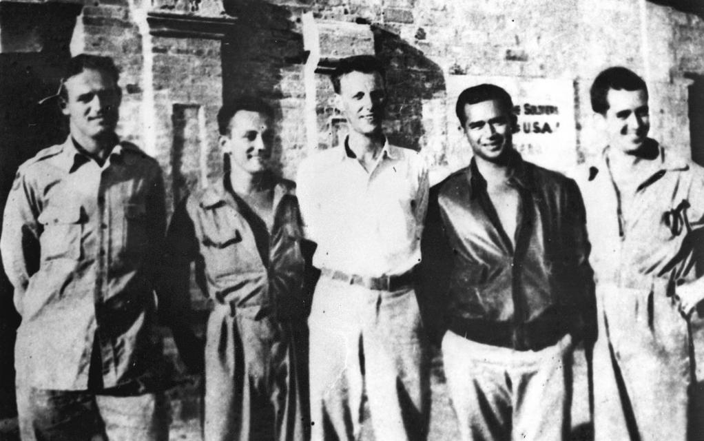 二战期间,被新四军营救的5名美国“飞虎队”飞行员在新四军驻地合影(资料照片,1944年8月摄)。