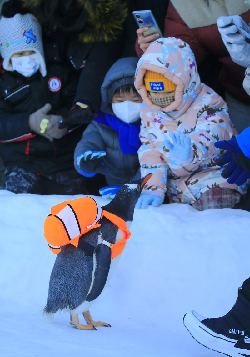 “淘学企鹅”与小游客互动。