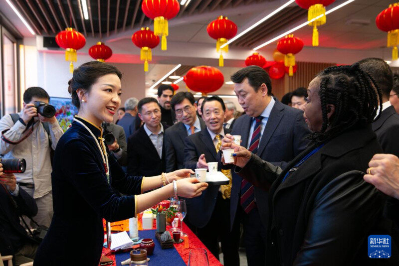 2月2日,人们在位于意大利罗马的联合国粮农组织总部体验中国茶艺。新华社记者 李京 摄
