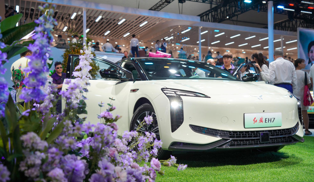 7月13日,观众在第21届长春国际汽车博览会的红旗品牌展区参观EH7车型。新华社记者 颜麟蕴 摄