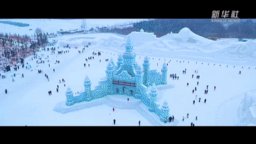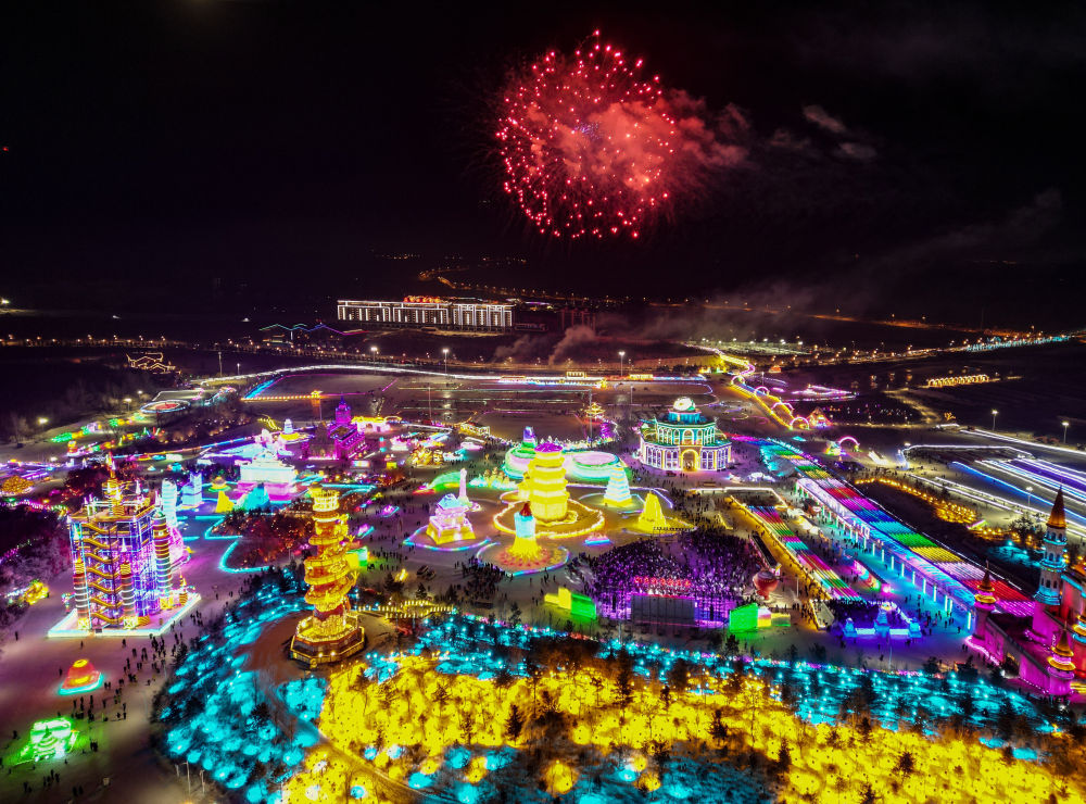 2月24日,游客在长春冰雪新天地欣赏冰灯和烟花表演(无人机照片)。新华社记者 颜麟蕴 摄