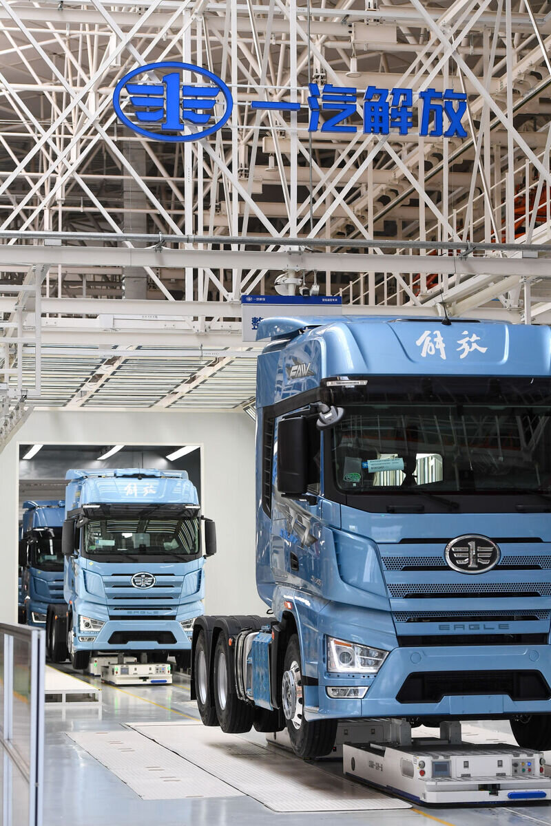 8月9日,在位于吉林长春的一汽解放汽车有限公司J7智能工厂内,AGV搬运机器人搬运车辆行进在生产线上。新华社记者 张楠 摄