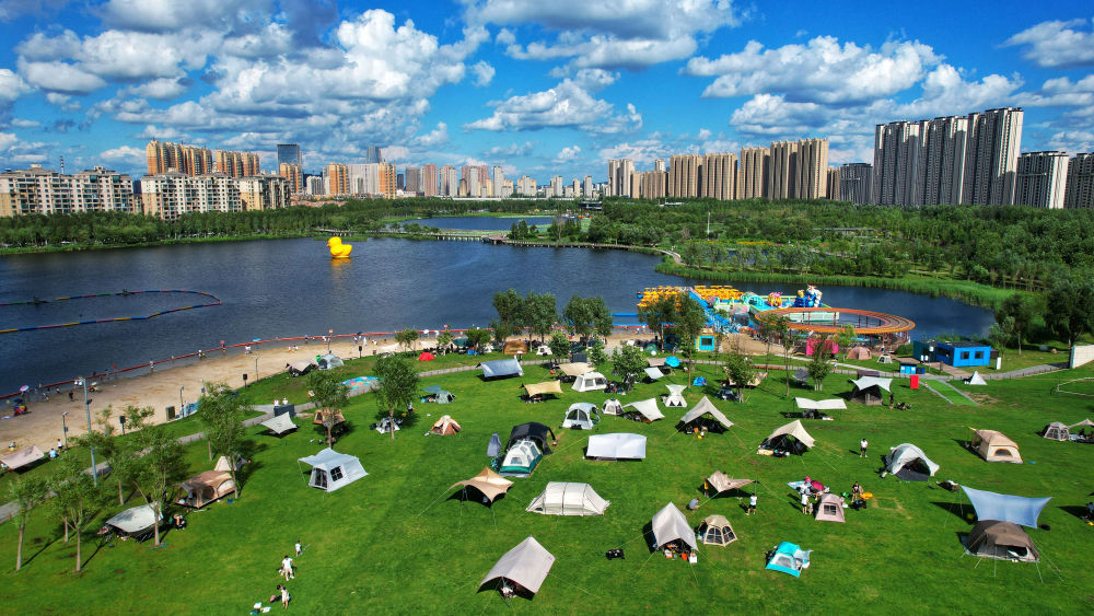 7月29日,市民在长春市南溪湿地公园内露营(无人机照片)。新华社记者 许畅 摄