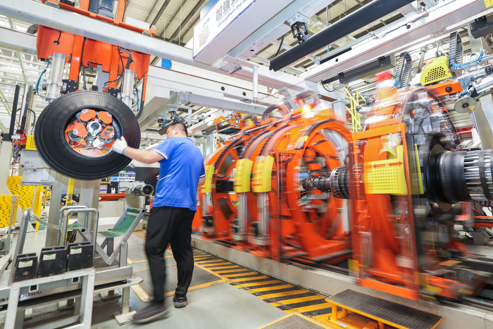 9月3日,在位于长春汽车经济技术开发区的吉林玲珑轮胎有限公司生产车间内,工人使用成型机加工轮胎产品。新华社记者 许畅 摄