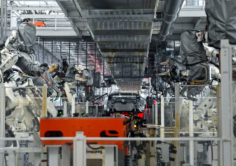 8月5日,在长春市一汽红旗制造中心繁荣厂区的焊装车间内,焊装机器人在生产线上焊接车身。新华社记者 颜麟蕴 摄