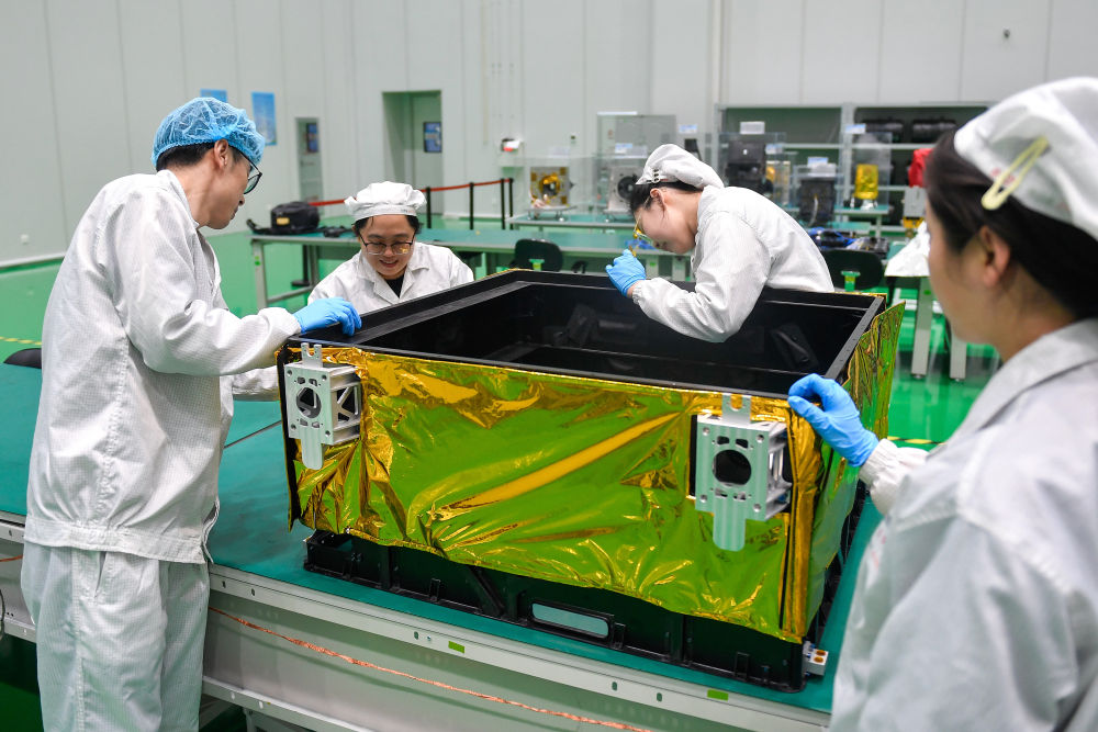 在吉林省长春市,长光卫星技术股份有限公司科研人员将制作完成的多层隔热组件包覆在卫星外壳部件上(4月2日摄)。新华社记者 许畅 摄