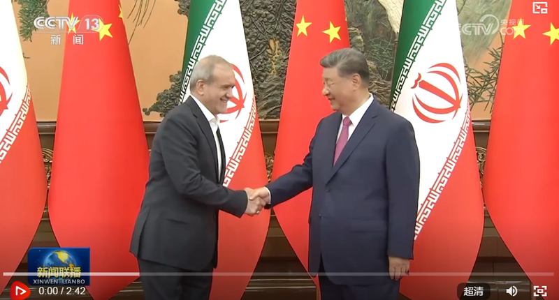 习近平指出,中伊关系经受住国际风云变幻考验,保持平稳健康发展。去年我们在喀山会晤后,两国各部门积极落实双方达成的重要共识,中伊各领域合作取得不少新成果。中方始终把发展对伊关系置于中国中东外交重要位置,愿同伊方赓续友好,深化互信,加强在贸易、投资、清洁能源、互联互通等领域合作,增进人文交往,携手推动中伊全面战略伙伴关系行稳致远。中方提出全球治理倡议,愿同包括伊朗在内的国际社会一道,推动构建更加公正合理的全球治理体系,携手构建人类命运共同体。