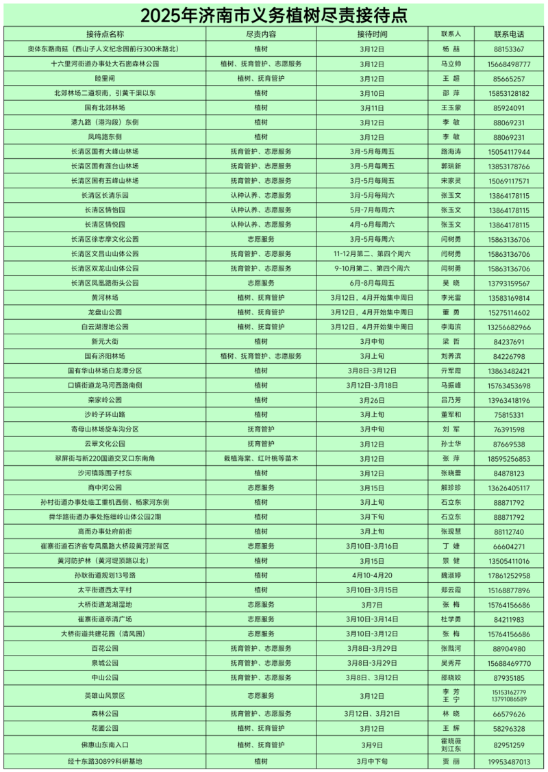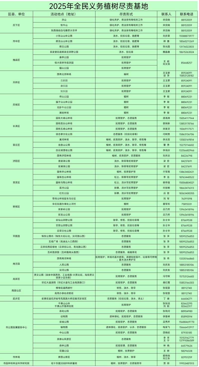 想全年为建设美丽泉城出力?没问题!63处尽责基地开放树木抚育、志愿服务等多样活动,四季皆可“打卡”绿色行动。