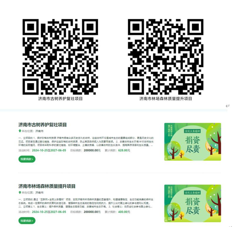 宅家也能“种春天”。2024年上线的“济南市林场森林质量提升”和“济南市古树养护复壮”项目,让尽责触手可及。扫码捐资或登录网站,一键参与。