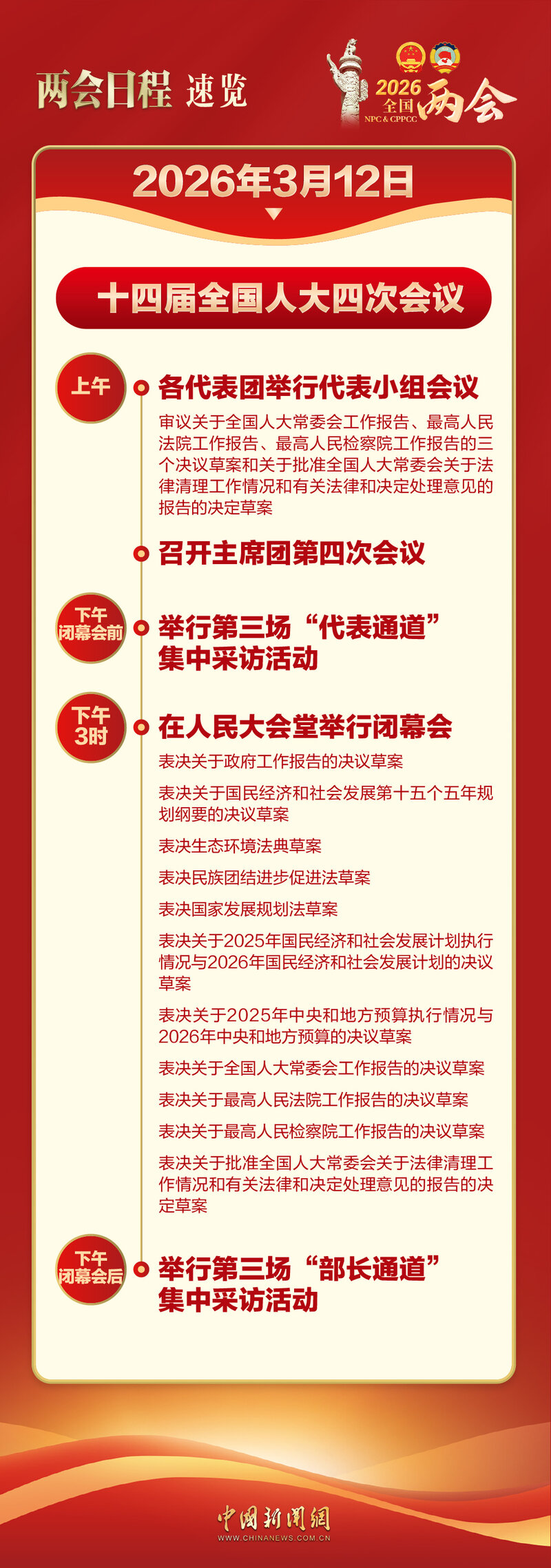另据人大会议新闻中心消息,12日14:00-14:40(闭幕会前),在人民大会堂中央大厅北侧举行十四届全国人大四次会议第三场“代表通道”集中采访活动,邀请部分全国人大代表接受采访。