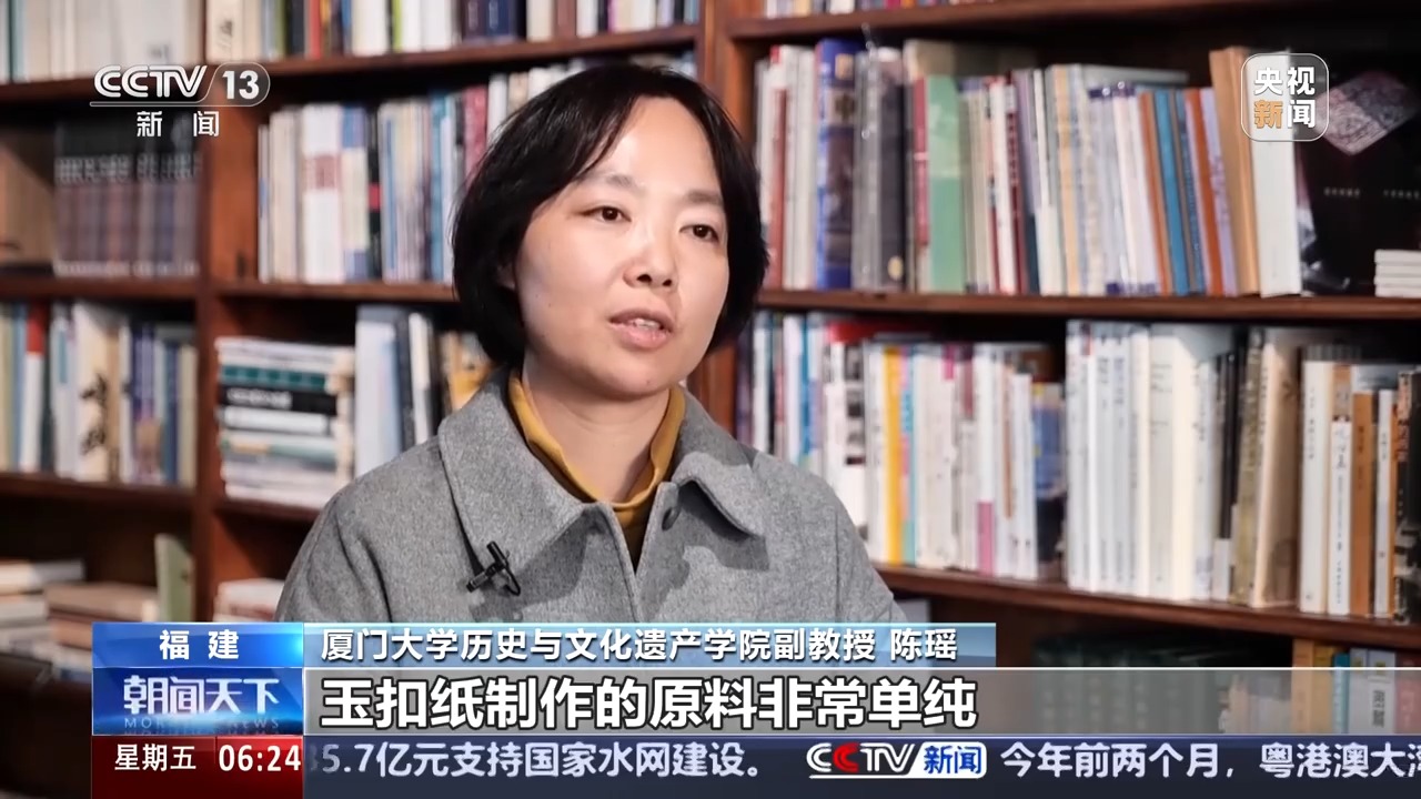 厦门大学历史与文化遗产学院副教授 陈瑶:玉扣纸制作的原料非常单纯。就是三种,一个是竹子嫩竹,第二个是石灰,第三个就是清洁的山泉水。基本上是纯靠人工来进行品质的管控。