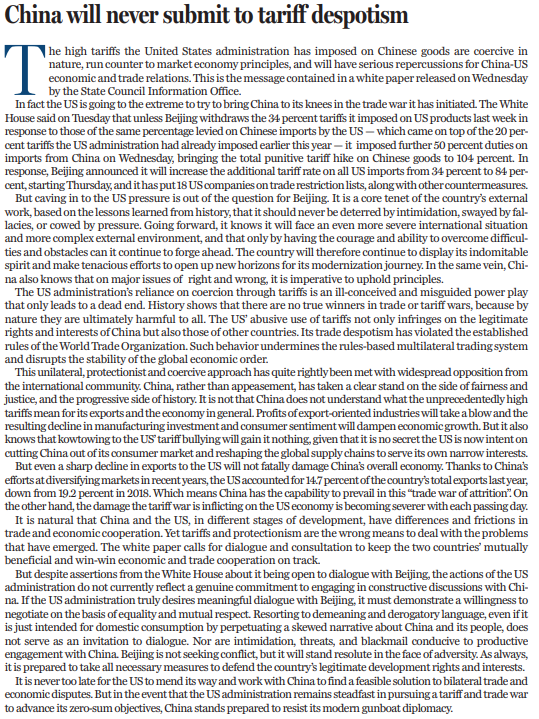 美国政府的关税胁迫是在玩弄强权,方向错误,只会走入死胡同。从历史上看,贸易战、关税战没有赢家,本质上不会对任何一方有利。美国滥用关税,侵犯了中国及其他国家的正当权益,且违反世界贸易组织规则,破坏以规则为基础的多边贸易体制,冲击全球经济秩序稳定。