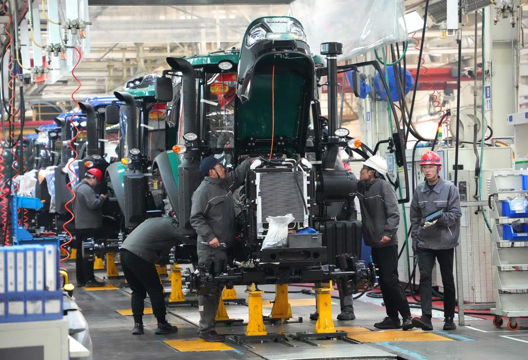 工人在位于潍坊市的潍柴雷沃智慧农业科技股份有限公司组装生产农机设备。