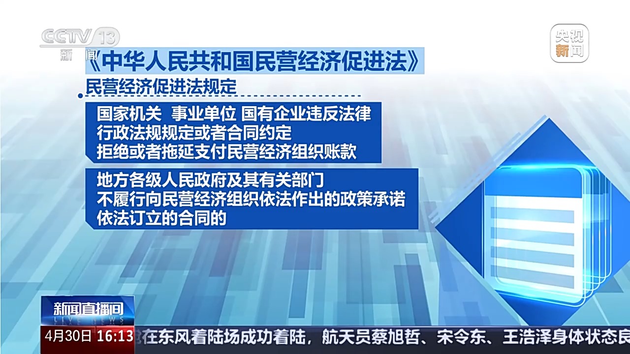 另外,民营经济促进法规定,国家机关、事业单位、国有企业违反法律、行政法规规定或者合同约定,拒绝或者拖延支付民营经济组织账款,地方各级人民政府及其有关部门不履行向民营经济组织依法作出的政策承诺、依法订立的合同的,由有权机关予以纠正,造成损失的,依法予以赔偿;造成不良后果或者影响的,对负有责任的领导人员和直接责任人员依法给予处分。