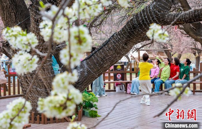 图为游客在乌素图杏花谷打卡拍照。 王劭凯 摄
