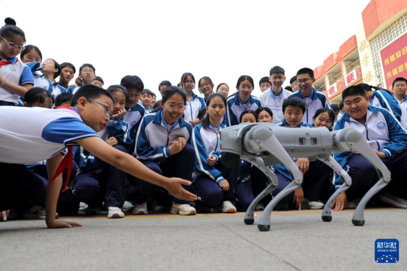 5月7日,在河南省济源市轵城镇校园科技节活动上,同学们与机器狗互动。