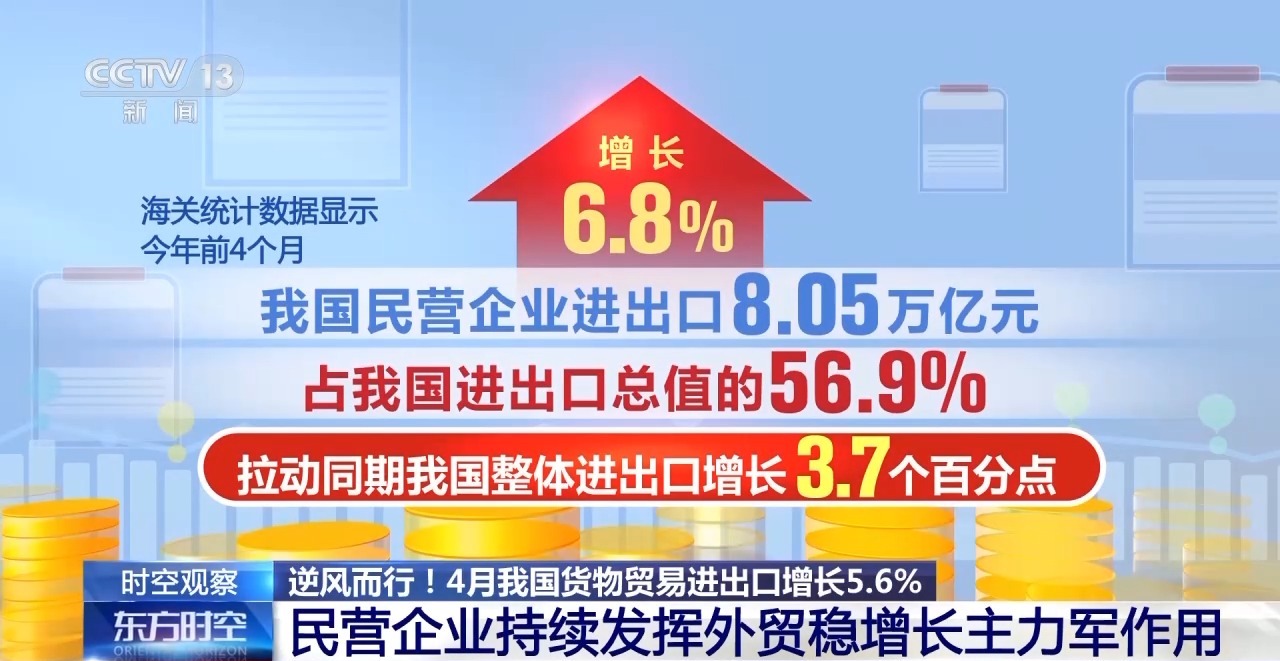 海关总署统计分析司司长 吕大良:今年以来,各项促进民营经济发展的政策措施协同发力,参与外贸的民营企业数量稳定增加。前4个月,有进出口实绩的民营企业达49.2万家,增加8.2%,占我国有进出口实际企业数量的86.5%。