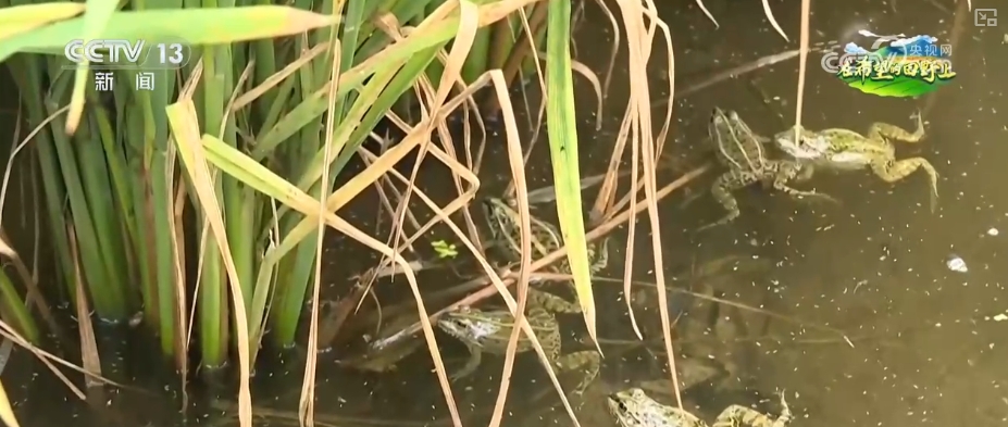 小鸭子们喜欢吃稻谷,它们会不会把稻田里的谷子也吃掉?为了防止这样的情况发生,这里采用的模式是“鸭蛙稻”模式,5月放鸭、7月放蛙,在水稻进入抽穗期,也就是有稻谷的时候,15万只小青蛙就会来接力管理这片农田,由它们来捕食害虫,替代杀虫剂。