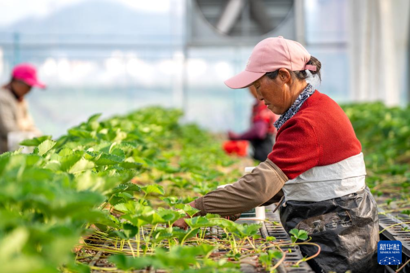 5月15日,工人在巧家县马树镇草莓种植基地育苗。