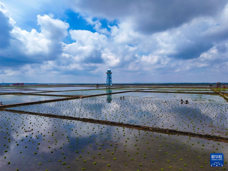 在黑龙江省佳木斯市富锦市的万亩水稻公园,一块块稻田宛若“天空之镜”,劳动者在“镜”中插秧作业,与蓝天白云、夕阳霞光构成壮美的农耕图景。
