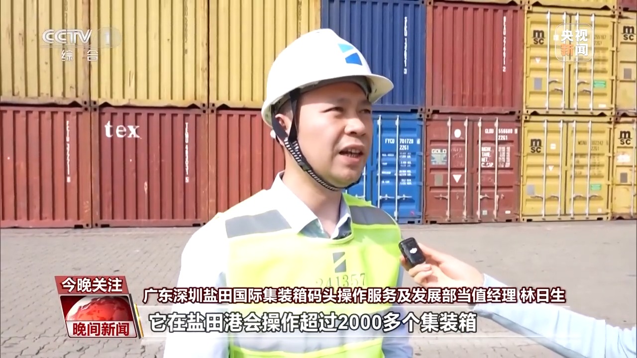 盐田国际集装箱码头操作服务及发展部当值经理 林日生:这是去往美国的一艘船,它在盐田港会操作超过2000多个集装箱。其他船公司全部都在协调码头来调靠泊位,码头每天都有6班船舶去往美国。