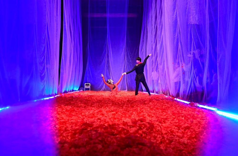 5月1日,在鄂尔多斯文化产业园景区沉浸式剧场,演员表演实景剧《凤鸣九曲》。新华社发(王正 摄)