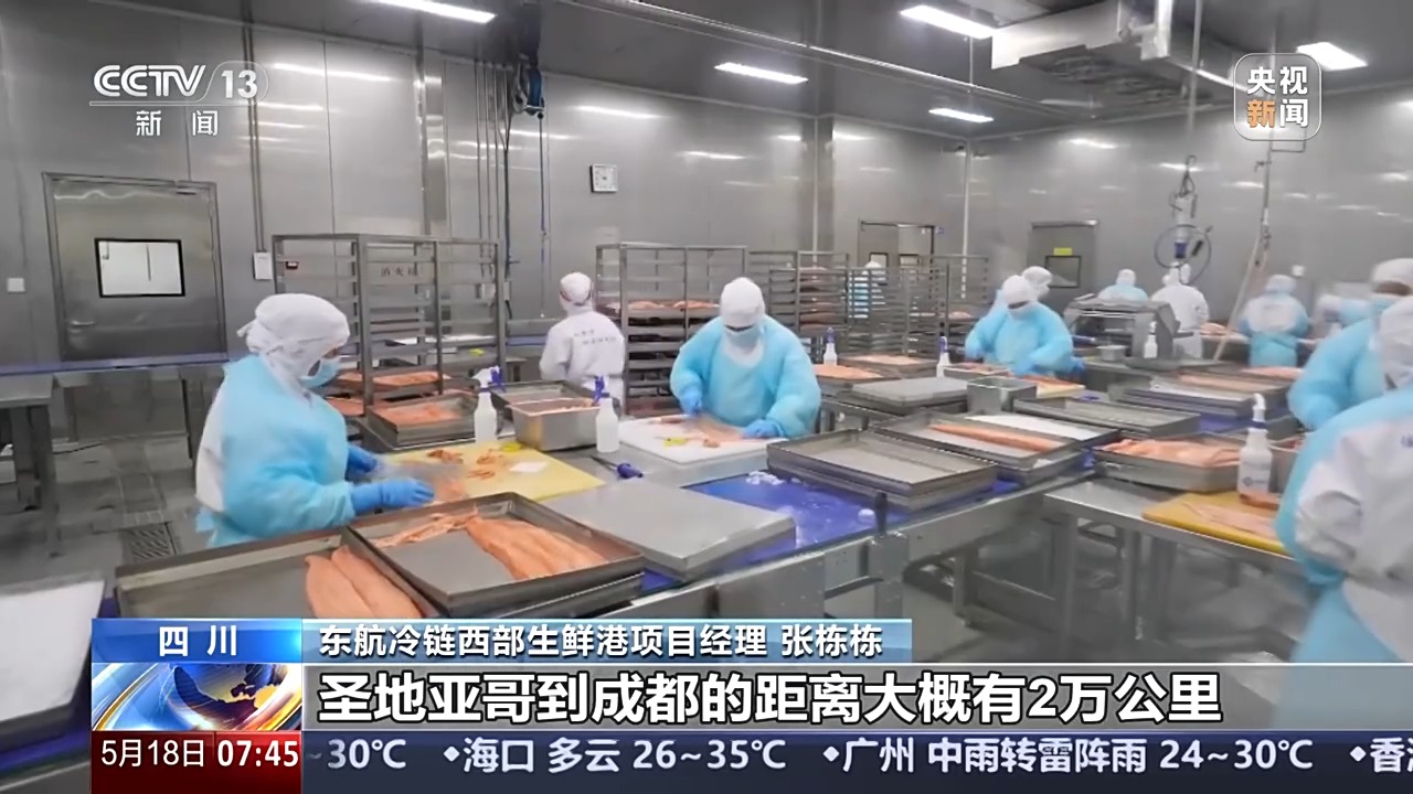 东航冷链西部生鲜港项目经理 张栋栋:冰鲜三文鱼的加工,其实是一场与时间的赛跑,圣地亚哥到成都的距离大概有2万公里,航线开通后,口岸加工、航线物流,还有终端配送,我们可以做到(最快)48个小时就能让成都当地的居民,吃到地球另一端过来的三文鱼。