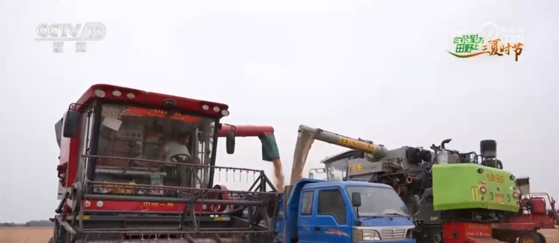 在河南南阳邓州构林镇这处麦田,金黄的麦浪层层铺开,麦穗在阳光下熠熠生辉。4台联合收割机开足马力穿梭在麦田间,伴随着机器的轰鸣声,成熟的小麦被快速收割、脱粒,金黄的麦粒从收割机的出粮口倾泻而出,装入一旁的运输车辆。