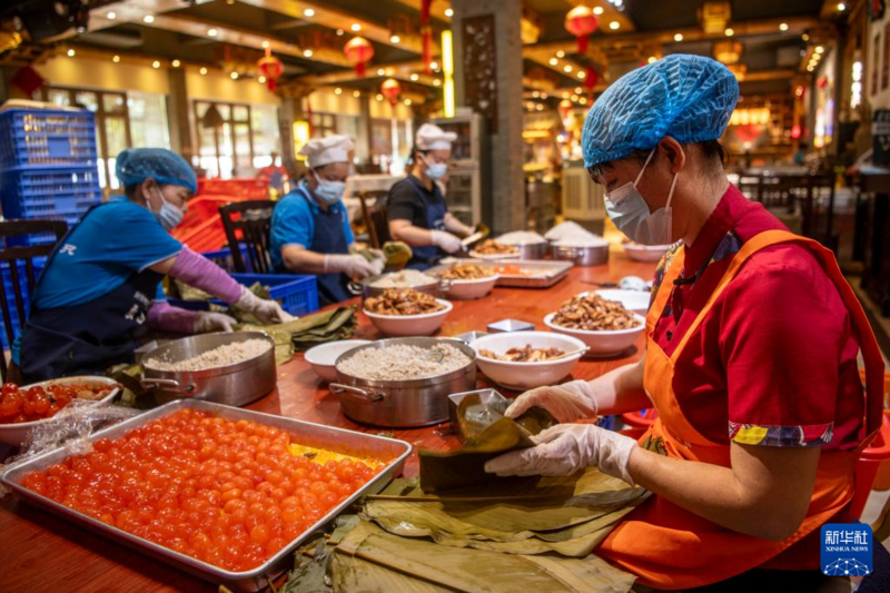 5月21日,海南省琼海市嘉积镇一家老字号酒店工作人员在赶制端午粽子。
