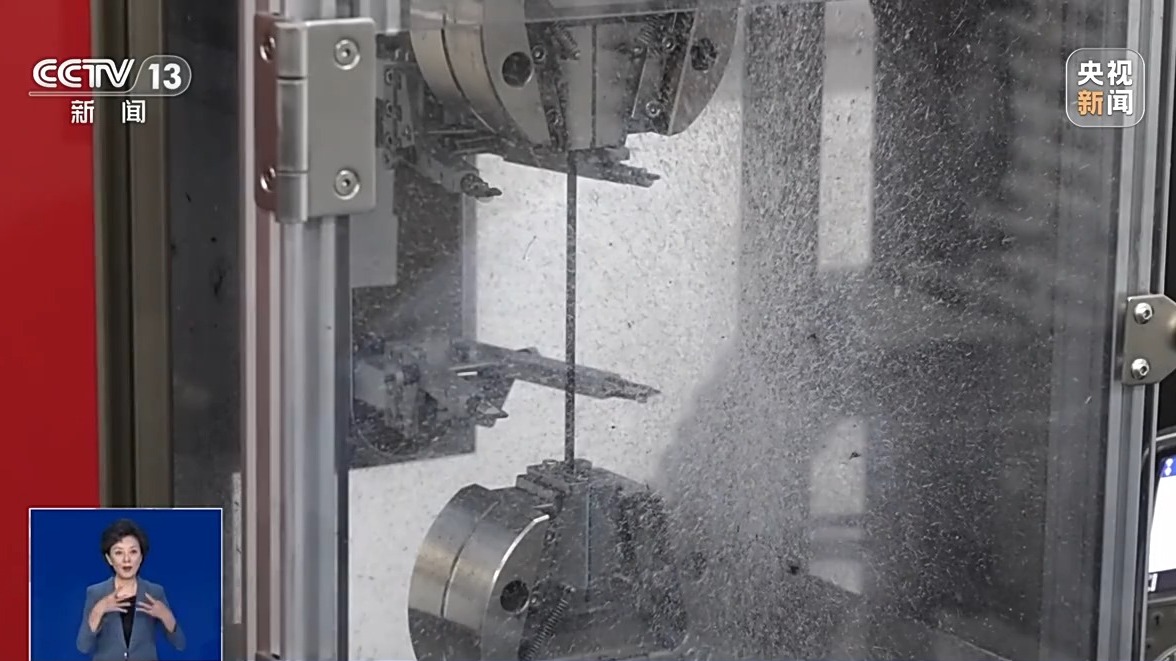 中国石化上海石化质量管理中心分析五车间副主任 林婷:刚刚我们做的是测试碳纤维强度性能的一个试验,目前我们碳纤维强度能达到40S的标准,就相当于这一根的样条,它的强度的值相当于我们家用2台汽车的牵引力总和。