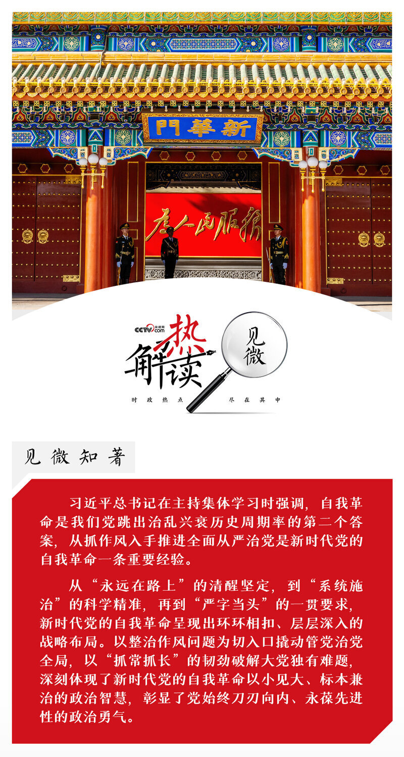 习近平总书记在主持学习时强调:“自我革命是我们党跳出治乱兴衰历史周期率的第二个答案,从抓作风入手推进全面从严治党是新时代党的自我革命一条重要经验。”