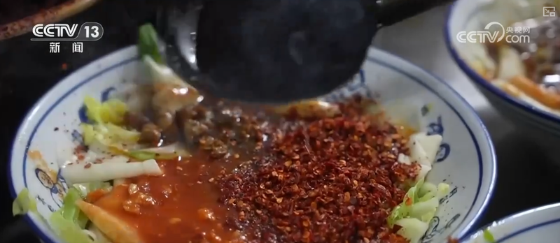 说到面食,绕不过陕西著名的𰻞𰻞面。这种面的特点是宽厚筋道,下锅煮熟以后捞出,要撒上葱姜蒜和辣椒面,再泼上一勺热油。