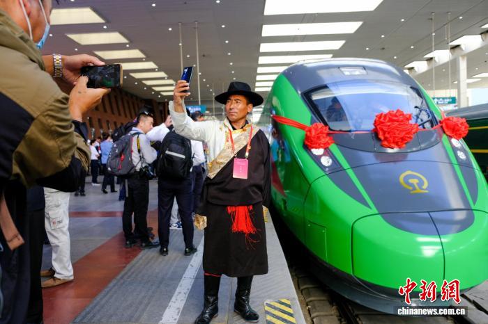 资料图为2021年6月25日,西藏拉林铁路开通运营,民众在拉萨火车站与复兴号拍照留念。当日,斯朗旺扎系首发司机。中新网记者 江飞波 摄