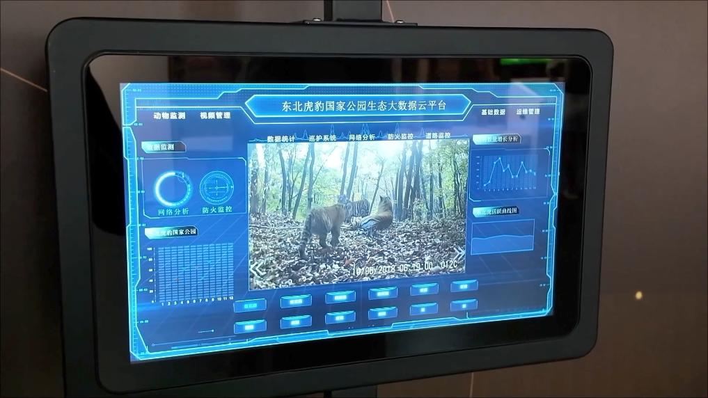 在吉林省珲春东北虎豹自然科普馆,东北虎豹国家公园的“天空地一体化监测体系”通过智能红外相机、卫星遥感、无人机等技术,回传野生动物活动影像。